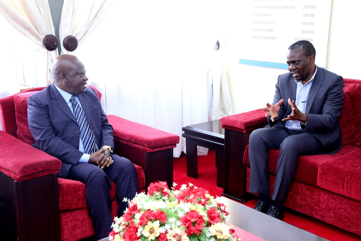 Spika wa Bunge, Job Ndugai (kushoto) akizungumza na Mkurugenzi Mtendaji wa Kampuni ya VunjaBei Group, Fred Ngajiro alipomtembelea leo Ofisini kwake Bungeni Jijini Dodoma, Septemba 8, 2021